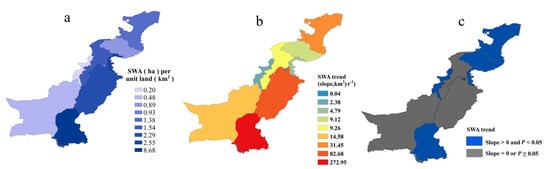 The year-long SWA in the China–Pakistan Economic Corridor (CPEC) showed an increasing trend from 2002 to 2018. The distribution of the SWA varied across different regions, ranging from 0.2 ha/km2 in FATA to 8.68 ha/km2 in Sindh in 2018 (Figure 3a). Considering the five regions analyzed (Kashi, Khyber Pakhtunkhwa, Azad Kashmir, Islamabad capital territory, and Sindh), they all showed significantly increased trends in the SWA from 2002 to 2018 (Figure 3b,c). With an increasing slope of 272.94 km2/year, Sindh had the highest, followed by Punjab (82.68 km2/year) and Kashi (31.45 km2/year). Islamabad’s capital territory had the lowest slope of 0.04 km2/year. Other regions of the research area did not show significant upward trends.