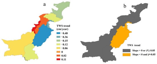 The TWS in the different regions of Pakistan, including Kashi, Gilgit Baltistan, Azad Kashmir, Punjab, Sindh, and Balochistan, showed a declining trend from 2002 to 2018 (Figure 4a,b). Among these regions, Punjab exhibited a significant decrease in TWS with a slope of −0.48 cm/year, indicating a higher demand for irrigation and population growth as the main factors contributing to this decline. Azad Kashmir followed with a decrease in TWS at a rate of −0.36 cm/year. Kashi also showed a decreasing trend, but the change was not statistically significant (Figure 4a,b). On the other hand, Khyber Pakhtunkhwa and FATA exhibited an insignificant increase in TWS, with values of 0.02 cm/year and 0.11 cm/year, respectively (Figure 4a,b).
