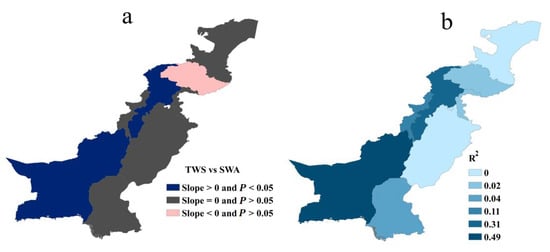 (2) Correlation analysis revealed that the SWA and climate change were the primary factors influencing TWS changes in Balochistan, while FATA changes were mainly influenced by climate change. On the other hand, human activities had a primary impact on TWS changes in Azad Kashmir, Punjab, and Sindh.