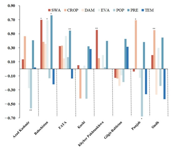 To examine the factors contributing to TWS, six variables (SWA, CROP, EVA, POP, PRE, and TEM) were chosen (Figure 6). The correlation between TWS changes and POP was statistically significant in Azad Kashmir (p < 0.01) (Figure 6), whereas in Balochistan, it was significantly associated with the SWA (p < 0.05), EVA (p < 0.05), and PRE (p < 0.05). In FATA, TWS changes showed a significant correlation with PRE (p < 0.01), in Punjab with CROP (p < 0.05) and POP (p < 0.05), and in Sindh with CROP (p < 0.01). Conversely, the changes in TWS in Kashi and Gilgit–Baltistan showed insignificant correlations with these factors during the period of 2002–2018. These findings suggest that the TWS changes in Balochistan were primarily influenced by the SWA and climate change, with climate change having the greatest impact on FATA specifically. In contrast, TWS changes in Azad Kashmir, Punjab, and Sindh were primarily impacted by human activities.