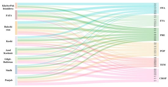 Nevertheless, the significance of the correlation could not serve as the foundation for attributing the driving factors to TWS alterations. Using Geodetector, an examination was carried out to evaluate the influence of the driving factors on fluctuations in TWS. The specific contribution of each of these factors to the variations in GRACE TWS was individually investigated within the framework of the CPEC (Figure 7). In Azad Kashmir, the top three factors influencing TWS were POP (q = 0.61), PRE (q = 0.46), and CROP (q = 0.38), in that order. For Balochistan, the key factors were EVA (q = 0.72), SWA (q = 0.68), and POP (q = 0.61). In FATA, the significant factors were SWA (q = 0.61), PRE (q = 0.55), and EVA (q = 0.55). Gilgit–Baltistan’s major factors were CROP (q = 0.57), PRE (q = 0.44), and EVA(q = 0.27). Kashi’s influencing factors were the SWA (q = 0.46), PRE (q = 0.46), and EVA (q = 0.40). For Sindh, the key factors were CROP (q = 0.71), POP (q = 0.54), and TEM (q = 0.48). Khyber Pakhtunkhwa’s significant factors were the SWA (q = 0.64), PRE (q = 0.35), and EVA (q = 0.26). Lastly, Punjab’s main factors were CROP (q = 0.73), POP (q = 0.64), and TEM (q = 0.49), in that order.