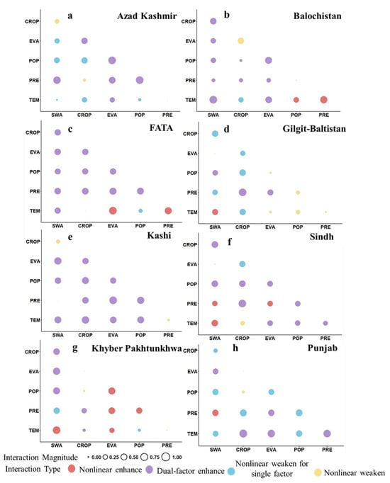 Contributions of driving factors interaction to TWS in the CPEC: (a) Azad Kashmir; (b) Balochistan; (c) FATA; (d) Gilgit-Baltistan; (e) Kashi; (f) Sindh; (g) Khyber Pakhtunkhwa; (h) Punjab. CROP represents the area of cropland, EVA represents the annual evaporation, POP represents population density, PRE represents annual precipitation, and TEM represents the annual average temperature.