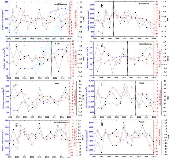 SWA, TWS, and the Standardized Precipitation–Evapotranspiration Index: (a) Azad Kashmir; (b) Balochistan; (c) FATA; (d) Gilgit–Baltistan; (e) Kashi; (f) Sindh; (g) Khyber Pakhtunkhwa; (h) Punjab. The SPEI is the Standardized Precipitation–Evapotranspiration Index. The dashed lines indicate the dam’s construction year.