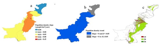 Trends of population density in Central Asia at the national scale from the fourth version of the Gridded Population of the World from 2002 to 2018: (a) the density of population; (b) the significance level of the population density change trend; (c) spatial distribution of land cover types in 2018: 10: cropland (rainfed), 20: cropland (irrigated or post-flooding), 30: mosaic cropland–natural vegetation (coverage rate greater than 50% natural vegetation (tree, shrub, and herbaceous cover) and less than 50% cropland).