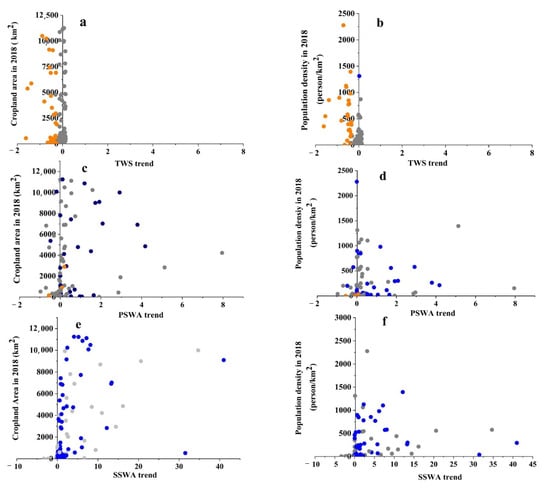 The relationships between TWS trends, PSWA trends, SSWA trends, population density in 2018, and cropland area in 2018 at the 0.5° grid scale. (a) TWS trend and the cropland area in 2018; (b) TWS trend and the cropland area in 2018; (c) PSWA trend and the population density in 2018; (d) PSWA trend and the population density in 2018; (e) SSWA trend and thr cropland area in 2018; (f) SSWA trend and the population density in 2018.