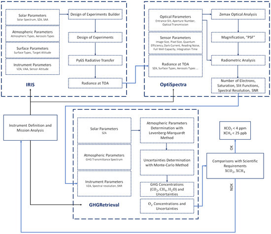 An end-to-end simulator named SolAtmos was developed to assess the performances of Uvsq-Sat NG [10]. Figure 1 illustrates the general implemented method. SolAtmos consists of three tools (IRIS, OptiSpectra, and GHGRetrieval) to enable the simulation of radiance datasets and the evaluation of the performances of several geophysical and instrumental parameters in estimating atmospheric gas columns, including CO2, CH4, O2, and H2O, as well as the associated uncertainties. SolAtmos is particularly valuable for determining the expected performance of space missions focused on observing GHG, and using the Sun as the primary source of illumination. It ensures XCO2 accuracy at levels under 4 ppm and XCH4 under 25 ppb for the Uvsq-Sat NG mission, complying with scientific requirements (Table 1). It is capable of fulfilling the requirements for the Uvsq-Sat NG NIR spectrometer, which operates in the 1200–2000 nm spectral range with a low spectral resolution of ∼5 nm. SolAtmos uses fast and moderately spectrally resolved radiative transfer simulations, suitable for broad analysis across a wide array of geophysical and instrumental parameters. Additionally, it provides slower but highly resolved radiative transfer simulations for in-depth examination of specific and selected configurations. The steps carried out with SolAtmos are described below.