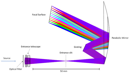 The OptiSpectra tool is used to determine the optical and radiometric performances of a space instrument. The first step of the process involves designing the optical architecture of the space instrument using Zemax OpticStudio software [33]. It works by ray tracing, a method that simulates the propagation of the radiance at TOA within the space instrument. To characterize the performances of the Uvsq-Sat NG spectrometer, the Zemax OpticStudio optical design program is used. Figure 2 shows the optical configuration of this space instrument, which is close to an Ebert–Fastie-type grating spectrometer. It is a specific design of a spectrometer that uses a single parabolic mirror for both collimating and focusing light (source), combined with a diffraction grating (300 groves per mm) for dispersing light into its constituent wavelengths to the the focal surface (Indium Gallium Arsenide (InGaAs) linear CMOS image sensor of 256 pixels equipped with a Peltier thermoelectric cooler). The optical filter located at the entrance of the spectrometer is designed to transmit specific portions (1200–2000 nm) of the radiance at TOA. The entrance telescope (lens doublet) enhances the spectrometer’s capacity, thereby improving its resolution and broadening its field of view. Thanks to the lens doublet, the telescope PSF on the entrance slit has a resolution that is negligible in the overall contribution of the system aberrations. The entrance slit plays a crucial role in defining the spectrometer’s resolution and overall performance. It impacts the Uvsq-Sat NG spectrometer resolution, sensitivity, and the overall quality of the spectral data that are obtained in orbit. The choice of the entrance slit size and shape is a compromise between resolution and sensitivity, which represents an important point for obtaining the most accurate GHG observations.