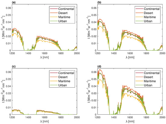 TOA radiance in 16 scenarios studied for different SZA and ‘Aerosol’ types—(a) Continental, (b) Desert, (c) Maritime, and (d) Urban aerosols.