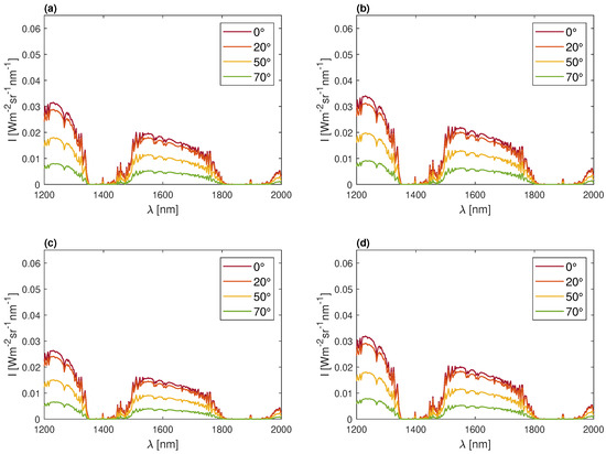 Furthermore, Figure 5 examines the influence of different aerosol types and SZAs for a pine forest scene. In this context, variations in SZA have a more significant impact on incoming solar radiance than the type of aerosols. Based on the results, it appears that the impact of aerosols on the solar spectra remains relatively consistent across the entire 1200–2000 nm range. There does not seem to be a distinctive spectral signature of aerosols in the near-infrared region. It might be worth conducting a study to explore the possibility of identifying an aerosol signature in the near-infrared range.