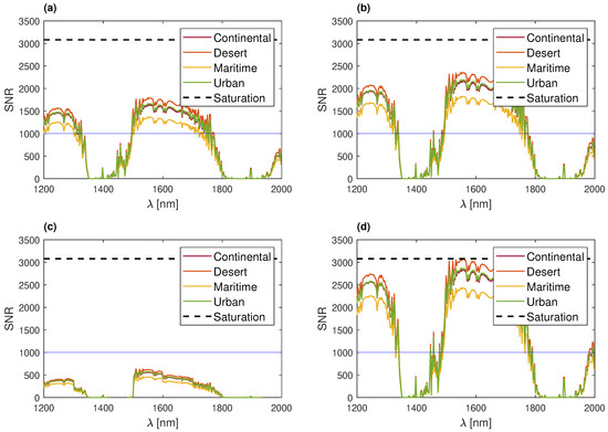 SNR of the spectrometer in 16 scenarios studied for different SZA and ‘Aerosol’ types—(a) Continental, (b) Desert, (c) Maritime, and (d) Urban aerosols. The blue line represents an arbitrary SNR value of 1000.