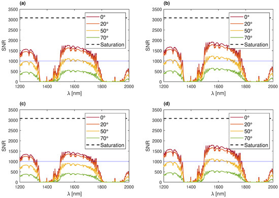 For most examined scenarios, a large number of values indicates that the SNR exceeds 1000, as depicted in Figure 6 and Figure 7. This is particularly evident in the spectral ranges of 1200 to 1300 nm and 1500 to 1750 nm. In the other bands, water absorption dominates and severely limits the signal.