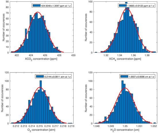 Retrieval of the concentration of gases that could be observed via the Uvsq-Sat NG NIR spectrometer (spectral resolution of 5 nm and SNR dependent on wavelength) for a specific observation scenario (targeted ‘Surface’—pine forest, ‘Aerosols’—continental, SZA of 20°). For obtaining the histograms, we find a mean square deviation equal to the uncertainty determined by the Levenberg–Marquardt algorithm.