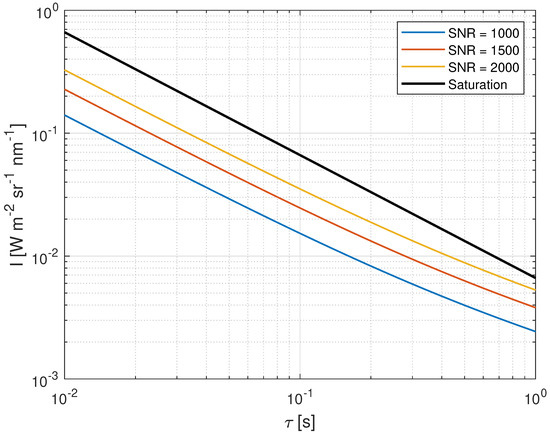 According to Equations (1) and (4), the SNR increases with the integration time; however, cannot be indefinitely increased due to the full-well capacity of the sensor. If the electron flux is too high, the sensor will saturate. The full-well capacity does not vary with the wavelength, so saturation depends only on the integration time and temperature, as described in Equation (5).
