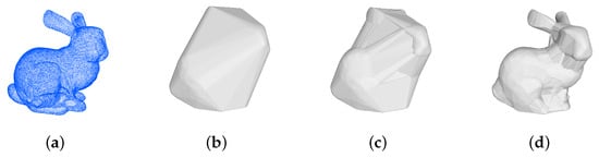 Illustration of 3D alpha shape: (a) the original point cloud of a rabbit; (b) the convex hull of the original point cloud; (c,d) the alpha shapes of the original point cloud; the used in (c) is 0.05 m, and the used in (d) is 0.01 m.