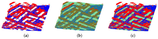 Comparison between 3D alpha shape and the modified 3D alpha shape: (a) the original point cloud (red for nonground points and bule for ground points); (b) result of the 3D alpha shape; (c) result of the modified 3D alpha shape. The green translucent surfaces in (b,c) are the resulting shapes.