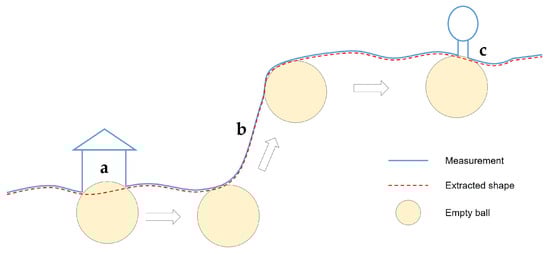 In this study, the 3D alpha shape was modified to be adaptable to extract the terrain. In the traditional 3D alpha shape algorithm, the triangle of the underlying 3D Delaunay triangulation is part of the resulting shape when the interval specifying the values for which this triangle belongs to the alpha shape contains the user-defined . In our modified version, the triangle must meet two additional conditions: First, the radius of the smallest circumcircle of should not be larger than . Second, the triangle must have at least one empty circumscribed sphere with a radius of located below the bottom of the point cloud. These additional conditions restrict the carving process below the bottom of the input point cloud so that only the bottom points are involved in the calculation (Figure 3). The procedure of the modified 3D alpha shape algorithm is presented in Algorithm 1. The kd tree and TIN constructed with the preprocessed points are used to determine the existence of an empty circumscribed sphere below the bottom of the point cloud. A circumscribed sphere is considered empty if its center contains only three neighbors, which are the vertices of the triangle, within radius . Moreover, a sphere is considered to be below the original point cloud if its center is located beneath the TIN representing the bottom surface.
