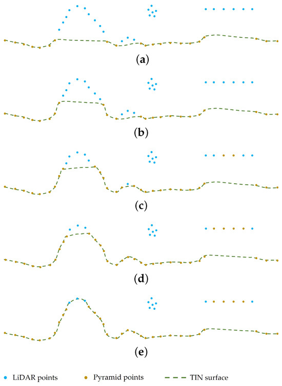 Procedure for multiscale TIN densification. (a) the top layer that provides seed points; (b–d) extraction of ground points in the lower layers of the data pyramid; (e) extraction of final ground points.