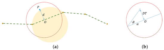 In this approach, the determination of the used in each layer is crucial. The residuals of ground points to the TIN, which represents the ground surface, are larger than those of nonground objects. Therefore, ground and nonground points can be differentiated using an appropriate . In the starting layers, should be large enough to recover as much as possible of the terrain, because the initial surface is rough. However, for subsequent layers, should gradually decrease to avoid misclassifying small nonground objects that are attached to the ground. As illustrated in Figure 7a, the distance d between the point P and its nearest TIN facet is calculated when detecting whether P is a ground point. Suppose that a ball exists with radius centered on O, which is the perpendicular foot of P to the nearest facet. is the relative slope that determines the value of . The distance threshold denoted by in the kth layer can be derived from the corresponding using the following formula: