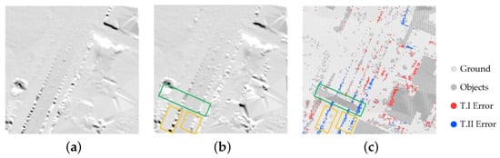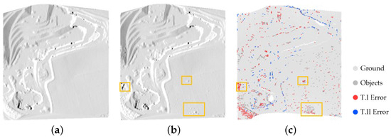 Filtering results for samp53: (a) the reference DTM, (b) filtered DTM, and (c) distribution of type I and type II errors. The slopes and cliffs were successfully extracted. The yellow rectangles indicate the areas where low vegetations were misclassified, resulting in small protuberance in the DTM.