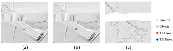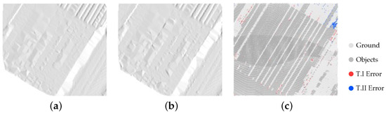 We used four accuracy metrics derived from the error matrix of the filtering results (see Table 1) and used in prior studies to evaluate the performance of the proposed method. The type I error (T.I), type II error (T.II), total error (T.E.), and kappa coefficient () were calculated and compared with those of some current top algorithms. Type I error (Equation (3)) is the percentage of ground points misclassified as nonground points, and type II error (Equation (4)) is the proportion of nonground points classified as ground points. The total error (Equation (5)) is the overall proportion of incorrectly classified points. The kappa coefficient (Equation (6)) is an alternative measure of the overall classification accuracy in which the effect of chance agreement is subtracted, and the increase in the accuracy of a particular classification is quantified compared with that of a random classification [49].