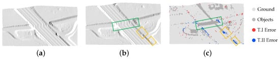 Filtering results for samp11: (a) the reference DTM, (b) filtered DTM, and (c) distribution of type I and type II errors. Most of the buildings were accurately filtered, and the road on the slope was accurately extracted (indicated with a green rectangle). The yellow rectangles indicate the areas where the roof of terraced buildings was misclassified.