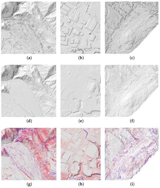 Filtering results on test samples in OpenGF: (first column) Test I; (second column) Test II (without outliers); (third column) Test III. (a–c) The DSMs of the test samples; (d–f) the DTMs constructed with the filtering results; (g–i) distribution of type I and type II errors (red for type I errors and blue for type II errors).
