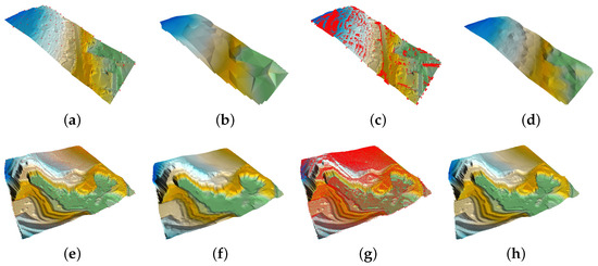 Ground seeds of representative samples (samp11 for urban areas and samp53 for rural areas): (a,e) overlay result of reference DTM and ground seeds (the red points) extracted using cell lowest point; (b,f) DTM generated with these seeds; (c,g) Overlay result of reference DTM and ground seeds extracted with our method, and (d,h) DTM generated with these seeds.