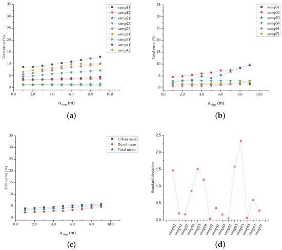 Analysis of sensitivities to parameter : (a) total errors for samples in urban areas; (b) total errors for samples in rural areas; (c) mean total errors of samples; (d) standard deviation of the total error for each sample.