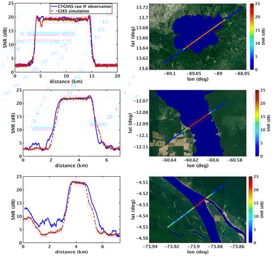The validation cases are shown in Figure 1 for raw IF data collections made over the Río Santiago in Peru on 17 March 2022 (top row), a more recent overpass of Lake Ilopango in El Salvador than that considered in [], on 8 October 2023, which skims the edge of the water body (middle row), and the Roosevelt River in Brazil on 26 March 2022 (bottom row). The figures in the left column show the simulated SNR from the E2ES (dashed red lines) plotted vs. the SP track distance along with the processed CYGNSS raw IF observations (solid blue lines). The right column shows the georeferenced SP track on the Earth’s surface relative to Google Earth imagery of the water bodies (colored line), where the line color is proportional to the observed SNR magnitude. The water mask used in each simulation is overlaid on the maps in dark blue. The water mask for each of these simulations is derived from Landsat or Google Earth imagery using a simple land/water classifier. The CYGNSS raw IF data are coherently averaged for 1 ms. We subsequently process the raw IF data with 50 ms incoherent averaging in 1 ms time steps, creating a continuous signal. Incoherent averaging of the simulated signal is conducted over a 50 ms window to match the processed CYGNSS raw IF data. Noise is added using the empirical noise model in Equation (3).