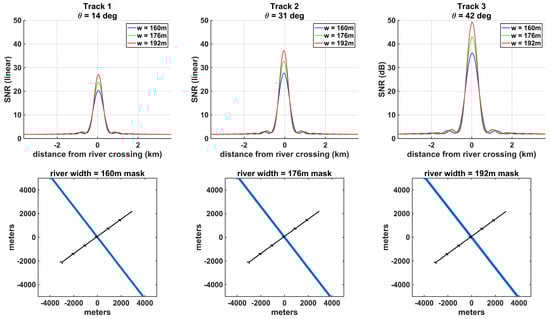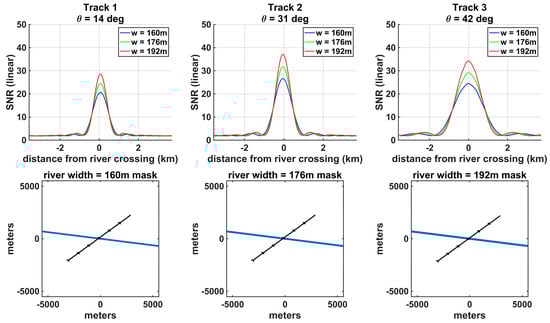 Simulations of straight river overpasses where the SP track makes a perpendicular (angle = 90 degrees) approach angle relative to the river orientation, for Track 1 (left column), Track 2 (middle column), and Track 3 (right column). (Top row) shows the simulated SNR for river widths of 160 m (blue lines), 176 m (green lines), and 192 m (red lines), corresponding to the input masks shown in the (bottom row), where the river is shown as the blue line and SP tracks as shown as the black arrowed lines.