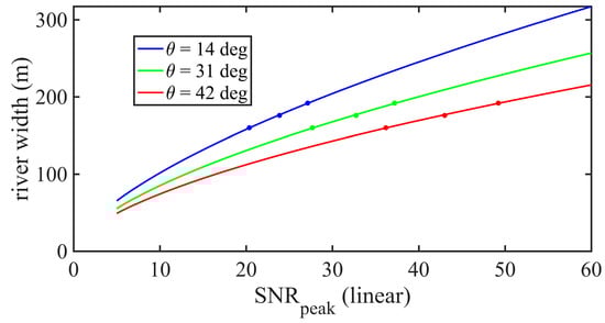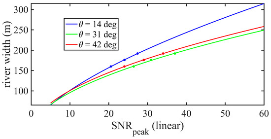 The relationship between the SNR peak and river width for the oblique approach angle cases is shown in Figure 6, and the resulting regression coefficients for the estimation of river width from the SNR are shown in Table 4.
