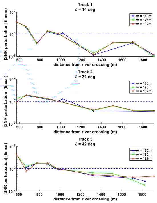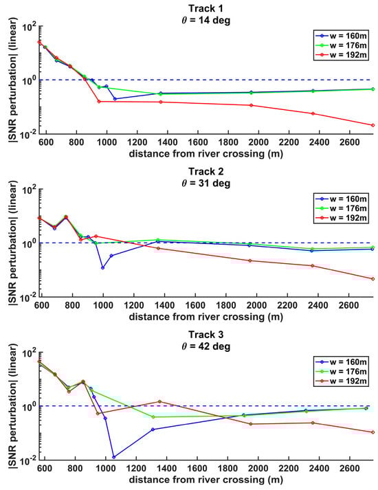Because of the non-linear behavior of the SNR peak with respect to the lake distance and the finite number of simulations run, the exact distance of the lake from the river SP crossing where the SNR perturbation becomes significant cannot be determined by these simulations, but these results indicate that clutter from large (in the order of 1 km wide) water bodies located within 500 m of a river can introduce perturbations in the peak SNR at the river center, while large water bodies located >~900 m from the river do not significantly impact the peak SNR related to the river crossing.