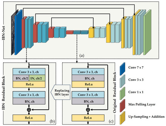 Architecture of the improved IBN-Net. (a) is the structure diagram of IBN-Net; (b) is the basic composition of the IBN residual block; (c) is the basic composition of the original residual block.
