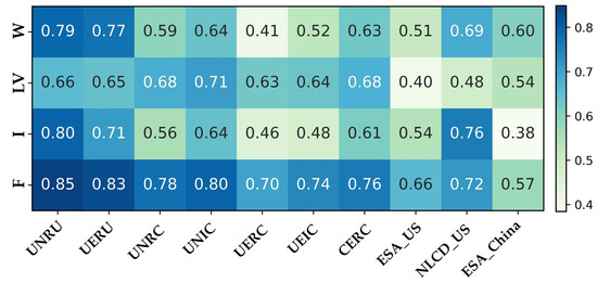 Five distinct land cover datasets were utilized in this experiment. To standardize the classification criteria and enhance the validation of the proposed methodology, a reclassification of sample labels was imperative. Owing to the absence of ice and snow across the chosen sample points, this specific land type is excluded from consideration. By harmonizing the label taxonomy, these classifications of all land cover products are amalgamated, culminating in the formation of four ultimate classes: water (W), low vegetation (LV), impervious surface (I), and forest (F). The detailed classification criteria are delineated in Table 2.
