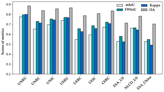 The IoU scores from distinct experiments also exhibit variations in the classification of diverse land cover categories. During the execution of land cover classification within identical geographical extents, the IoU score trends of the experimental outcomes harmonize predominantly with those of the LR labels (Figure 7). Specifically, the IoU scores for each classification category within models with NLCD_US surpass those with ESA_US. Across varying geographical zones, even with the same labels, the IoU scores for individual classes deviate. It is evident that beyond the influence of training data on the efficacy of land cover classification, the attributes and distinguishability of the ground entities within the target area also exert an impact on the performance of mapping. In terms of overall performance, a balanced and robust outcome is observed in the case of UNRU and UNIC. This outcome stands out when juxtaposed with the alternative comparison methods used in both the source and target domains.