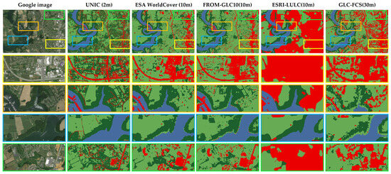 Statistical Comparison of Global Products with UNIC. The yellow, orange, blue and green rectangles represent the details of the four scenes in the sample area respectively.