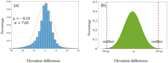 Statistical outlier detection scheme. (a) An example of a statistical histogram of elevation differences between an InSAR-DEM and an external DEM; elevation mean difference μ and standard deviation σ are listed; (b) A schematic diagram of outlier distribution under normal distribution, data outside the two red dashed lines represent outliers.