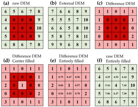 DSF implementation process. Various colors: light green for DEM data, red for data voids, and pink for the delta surface. (a) is raw DEMs; (b) is external DEMs; (c) = (b) − (a) is the delta surface corresponding to step (I); (d) is the delta surface center filled in large voids by mean value, corresponding to step (II); (e) is the delta surface filled and interpolated entirely, corresponding to step (III); (f) = (b) − (e) is the filled DEM corresponding to step (IV). Red represents void pixels, pink represents elevation difference pixels, and green represents elevation pixels.