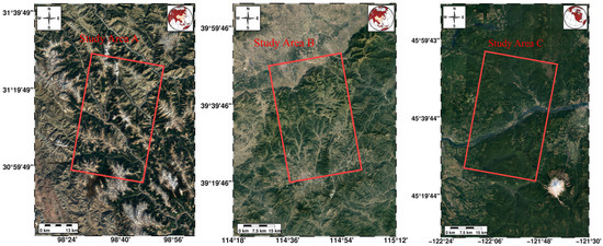 The location of the study areas and data coverage (red rectangular box). A, B, and C are data coverage maps of the three study areas of Sichuan, Hebei, and Oregon respectively.