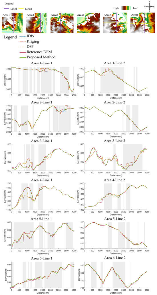 DEMs serve a crucial role in extracting and depicting significant terrain changes and features, where the discontinuity and reasonableness of terrain transformations are pivotal considerations. Drawing profiles of DEMs along selected cross-section lines at key locations provides a viable means with which to assess these factors. In Figure 11, two orthogonal sections were extracted from each of the aforementioned six small areas, and corresponding elevation change curves were plotted below. Cross-section line selection criteria involve opting for lines passing through void centers with heightened complexity and choosing two orthogonal lines to ensure sample representativeness, offering multidimensional insights. Figure 11 illustrates cross-section drawing using different methods: three colored dotted lines correspond to the traditional methods, the green solid line represents the proposed method, and the red solid line represents the reference DEM.