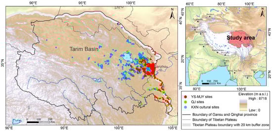 The NETP is defined in this study as the region where the TP intersects Gansu and Qinghai provinces (Figure 1). To account for the influence of adjacent areas, a 20 km buffer zone was added along the border of the TP. The natural environments in the NETP are diverse, with a complex topography and significant variations in regional landscapes that are heavily influenced by elevation [,]. The elevation in the NETP ranges between 928 and 6818 m, accompanied by a variety of landform types including plains, basins, hills, and mountains []. Based on data from 62 meteorological stations in the NETP, the annual temperature varies greatly (from −5.1 to 15.1 °C), with an average temperature of 4.2 °C. The average annual precipitation ranges from 15 to over 700 mm (http://data.cma.cn, accessed on 20 March 2024). The area sits in a typical semi-arid and semi-humid junction. Being situated in a marginal monsoon region, the climate, vegetation, and other landscape attributes of the TP are sensitive to global environmental change []. Furthermore, being centrally positioned in the eastern segment of the Silk Road, the NETP serves as a pivotal hub for continental cultural exchange and agricultural dispersal, with many exotic elements having emerged early in this region early on [,,].