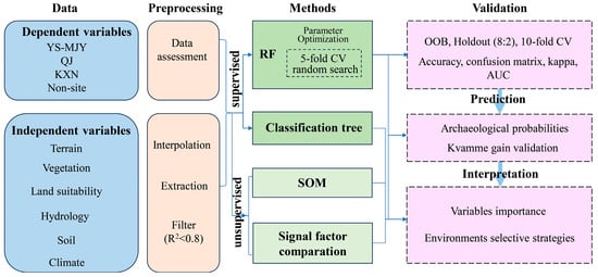 Through preliminary testing, RFs demonstrated excellent performance in terms of classification accuracy, robustness, and interpretability. Numerous similar studies have also reported these advantages, and the RF model has been widely applied for spatial prediction [,,,]. In our current study, we constructed a multi-classification RF model to predict cultural potential probabilities in a landscape scale across the entire NETP. An explanatory classification tree was also employed for archaeological interpretation. The modeling process is shown in Figure 2. To comprehensively explore the influence of multiple variables on settlement selection, we employed an unsupervised SOM to further investigate landscape differences from the Neolithic to Bronze Age. The main R packages used are introduced in Table 2.