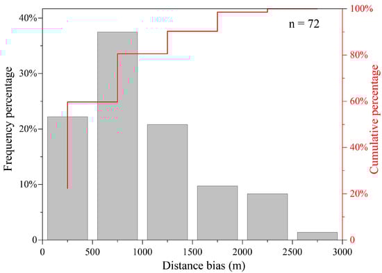 By comparing the locations of 72 known sites with those in the ‘Chinese Cultural Relic Atlas dataset’, we calculated the following positional deviation curves (Figure 3). The results show that ~60% of the site locations have a deviation within 1000 m and ~80% of the site locations have a deviation within 2000 m. This level of error might affect the interpretation of the microtopographic environment to some extent, but it minimally impacts the understanding of the broader, macroscopic distribution patterns. Hence, it was decided to construct a predictive model with a resolution of 1 km to achieve a reliable prediction in landscape scales.