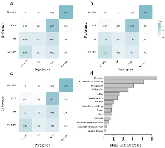 Moreover, the importance of these variables of the four-classification model was ranked based on mean Gini decrease, which is displayed in Figure 4d. To enhance interpretability, importance rankings were calculated for the three-classification model (YS-MJY, QJ, and KXN cultures) and the binary classification model (sites and non-sites). These can be found in Figure S4. All models agreed that the major four factors were elevation, cultivated land suitability, precipitation, and NDVI. Soil erosion degree showed significant importance in the binary classification model.