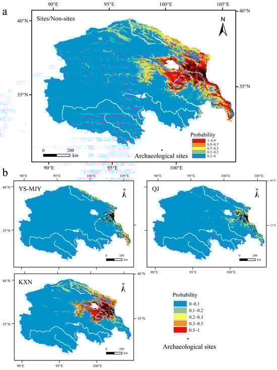 Prediction distribution probabilities for whole sites/non-sites (a), YS-MJY cultural sites, QJ cultural sites, and KXN cultural sites (b).