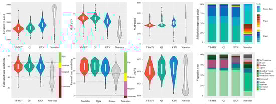 The violin and box plots visually depict the distribution of six crucial variables for the various cultural phases and non-sites (Figure 6). Non-sites exhibited significant disparities, which represented environments that were excessively harsh for human survival. The elevation gradually increased across the different cultural stages, while the MAT decreased, and the MAP fluctuated around 400 mm. Soil erosion types displayed a distinguish boundary for sites and non-sites. The main sites were located in moderately cultivated land suitability areas. The NDVI showed a slight increase from the Neolithic to Bronze Age. Vegetation coverage revealed a decline in forest percentage from the Neolithic to the Bronze Age. At the same time, the pastoral area (steppe, grassland, meadow, shrub) increased, and the percentage of cultivated area decreased, according to current patterns (Figure 4).