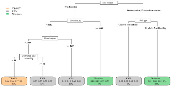 The classification tree figure (Figure 7) exhibits the relationship between environment and culture. Soil erosion was a primary factor, serving as a “root” to effectively distinguish between most sites and non-sites. Elevation also played an important role, with a boundary of 3363 m to distinguish non-sites, and a boundary of 2489 m to distinguish KXN cultural sites. Below the 2489 m elevation limit, cultivated land suitability became crucial, with a threshold of 58 distinguishing between the YS-MJY and KXN cultures. These results provide strong archaeological interpretability and offer a more objective partition threshold than previous studies have.