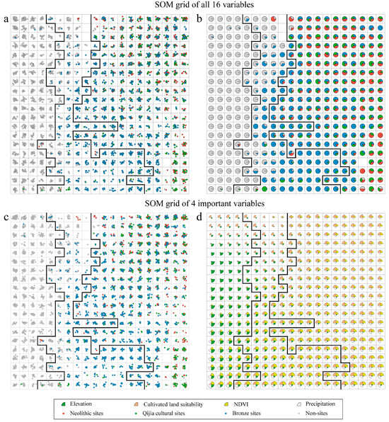 SOM grid map of all 16 variables points for (a) and pie for (b); distinct colors signify cultures. SOM grid map of 4 important variables (c), and the corresponding code map; for each cell, the sector area represents the weight of the variable and different colors represent environmental factors (d). The left black line represents the environment boundaries for distinguishing sites/non-sites and the right delineates boundary of the KXN culture versus others.