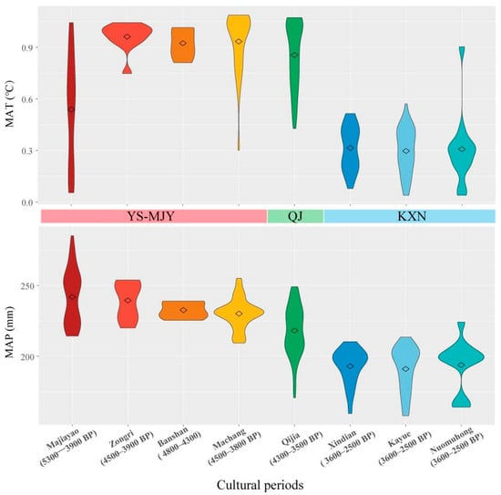 Climate change during different cultural periods in the TP. Temperature reconstruction records made use of a simulated mean annual temperature (MAT) in the TP [] and mean annual precipitation (MAP) made use of tree-ring records in Delingha []. For the cultural duration range, 14C data that we collected were used.