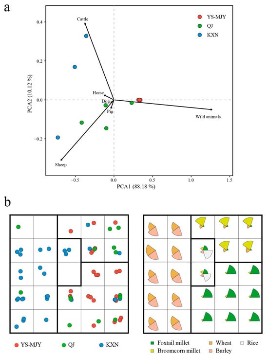 Subsistence strategy shifts during different cultural stages. PCA scores plot of animal resource utilization (a), SOM grid map and the corresponding code map for crops utilization. The black line divide sites into four different subsistence clusters (b).